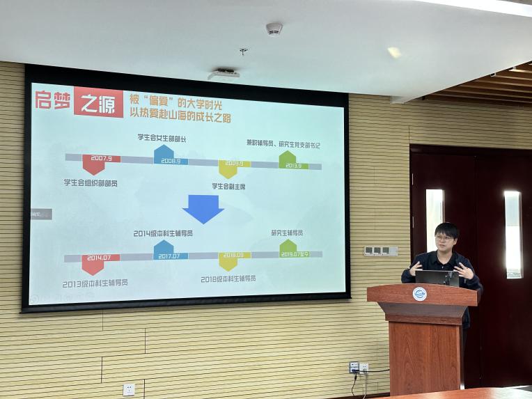 李欢欢以“青春梦想合伙人——辅导员工作实践与体会”为主题,从启梦之源、筑梦之旅、伴梦之行、逐梦之思四个方面向做汇报和交流。她认为,是学生时代地大、新葡的京集团3512vip的无私培养、关怀和温暖,坚定自己留校做辅导员的信念;是优良的学院教风学风和学工传统,使自己在学生思政教育与专业教育融合、专业技能与社会服务能力融合、专业理论学习与双创实践融合、教育管理与学生综合发展方面进行了积极探索,并收获成长与荣誉,成为学院这么多年来一代代优秀学生工作者薪火相传中的一把火、一束光。她表示,高校老师作为学生的“青春梦想合伙人”,在帮助学生追梦和圆梦的过程中,也在实现自己的人生梦想和人生价值。