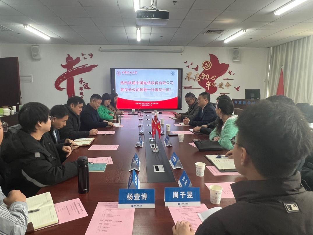 3月7日上午,中国电信股份有限公司武汉分公司来院调研座谈。双方在学院309会议室就校企合作、学生实习、就业等方面进行了深入交流。中国电信武汉分公司总经理代宏斌、副总经理覃兵、人力资源部主任石涛、校园部总经理吴峰等领导,新葡的京集团3512vip党委书记李国昌、副院长陈云亮、党委副书记林小艳等学院领导及辅导员代表参加会议。李国昌主持会议。