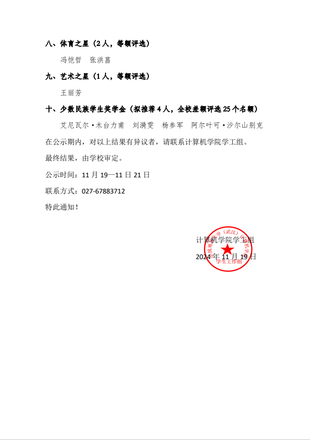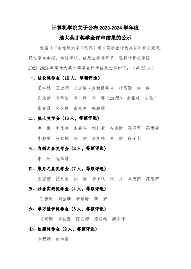 新葡的京集团3512vip关于公布2023-2024学年度地大英才奖学金评审结果的公示