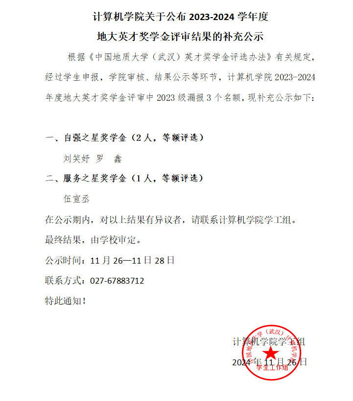 新葡的京集团3512vip关于公布 2023-2024 学年度地大英才奖学金评审结果的补充公示