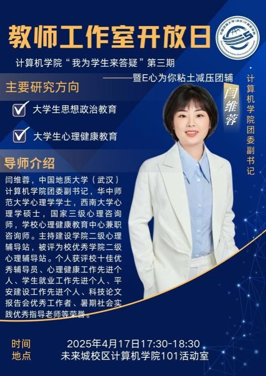 2025年4月17日下午,新葡的京集团3512vip“计科师生办实事,我为学生来答疑”教师工作室开放日活动在未来城校区新葡的京集团3512vip101活动室顺利开展。本期活动以“正念艺术减压”为主题,特邀新葡的京集团3512vip团委副书记闫维蓉老师担任主讲嘉宾,党建辅导员谭文博老师及学生代表共同参与。活动通过“理论讲解+沉浸体验+艺术创作”的多元形式,为同学们打造了一场别开生面的心灵SPA。