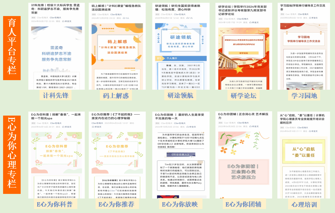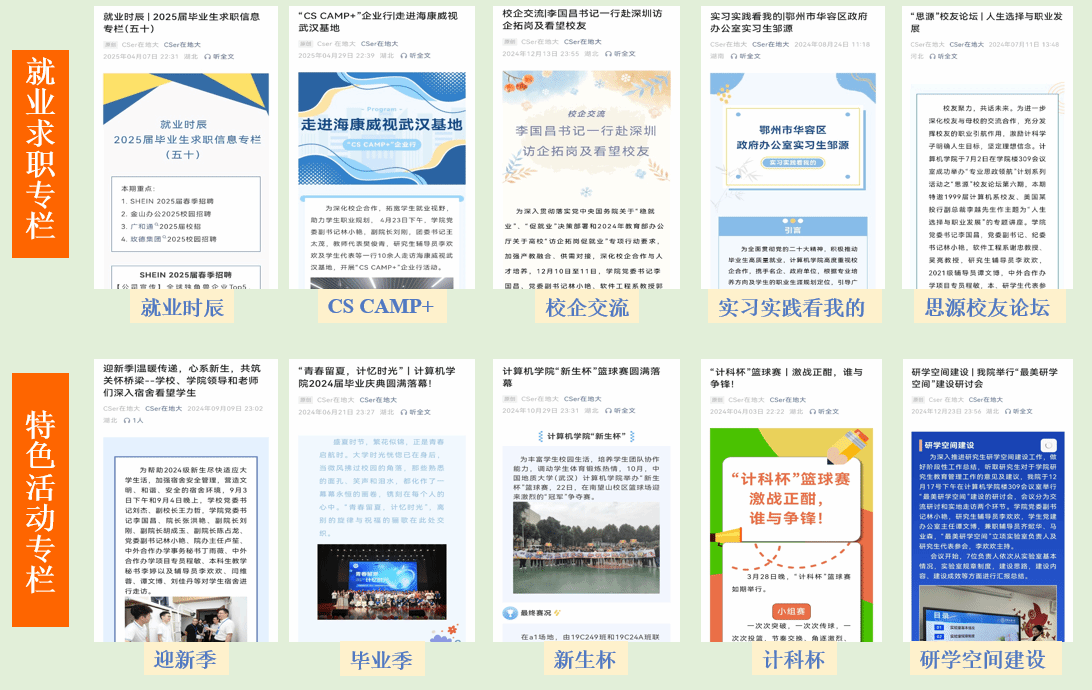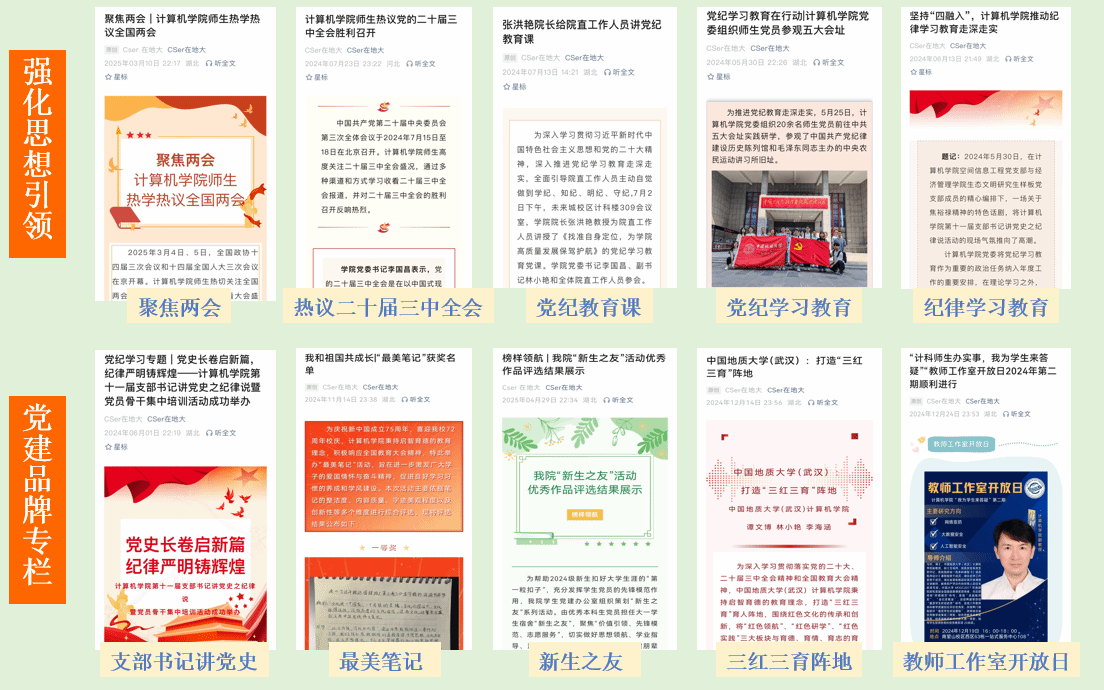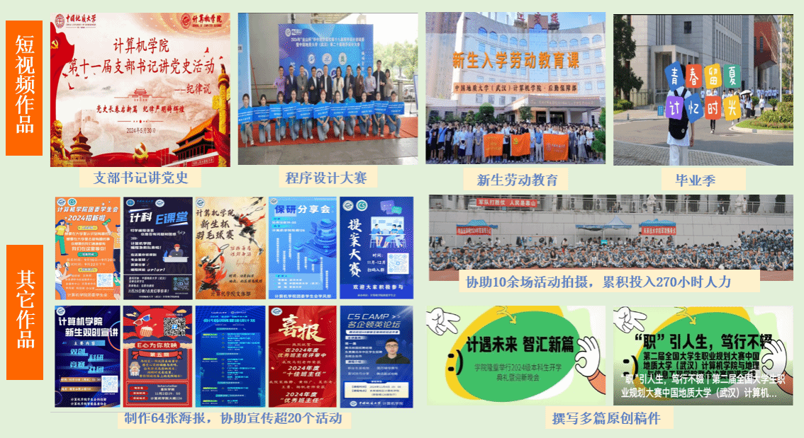 “CSer在地大”全年策划推出总推文数400+篇,总阅读数量超36万次,关注人数破万。“地大CS计小软”全年发布说说量700+篇,空间总浏览量近9万次,关注人数破千且持续增高。联动“山河网络工作室”和“后勤保障部”等制作推出《支部书记讲党史》、《新生入学劳动教育课》、《“金山杯”程序设计邀请赛》、《迎新季》、《毕业季》等系列短视频,形成“校-院-人”三级联动传播格局,有效扩大影响力。