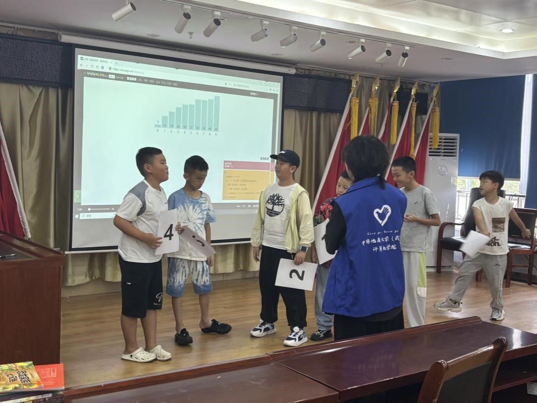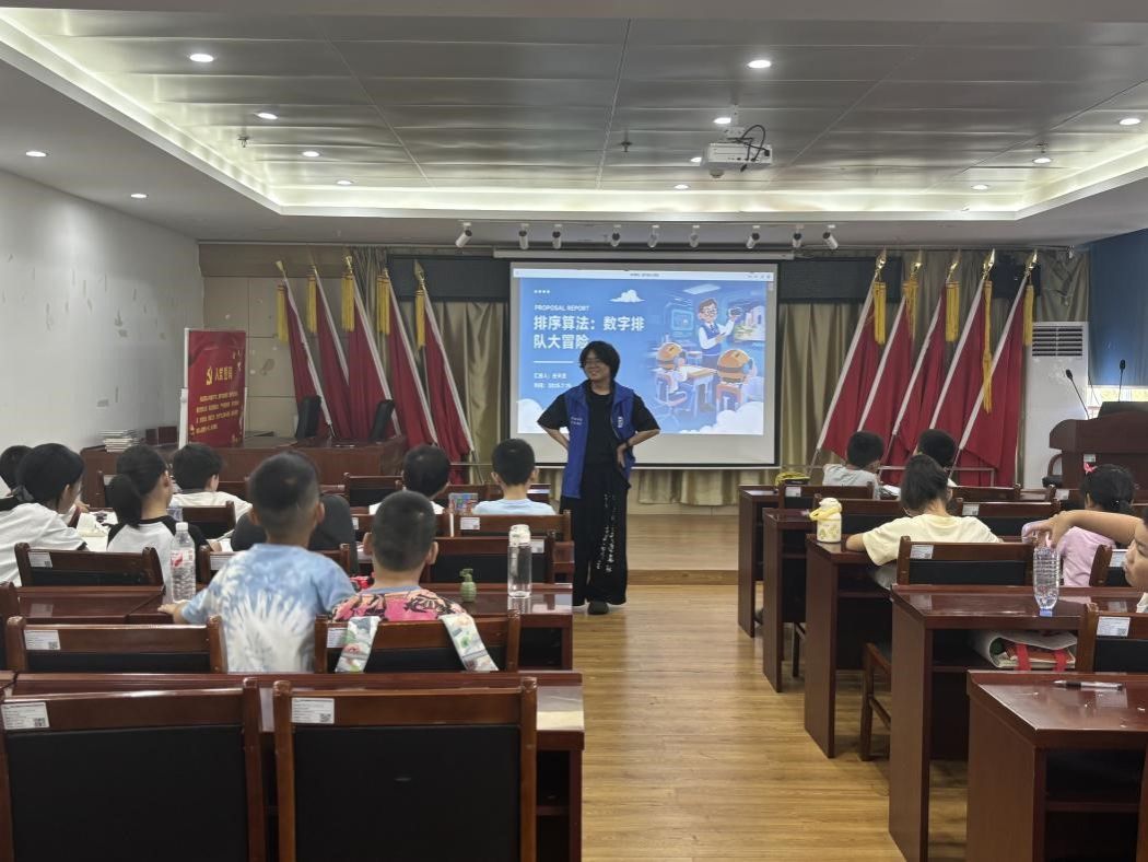 志愿者没有急于讲解原理,而是从生活聊起,排队买冰淇淋时怎么判断谁先谁后,整理书包时怎么把文具按大小归类,操场上怎样最快找到最高的那个人。这些看似寻常的小场景,其实都藏着排序的影子。孩子们一边听一边点头,时不时低声讨论,仿佛一下子发现了日常生活里原来有那么多“程序的逻辑”。